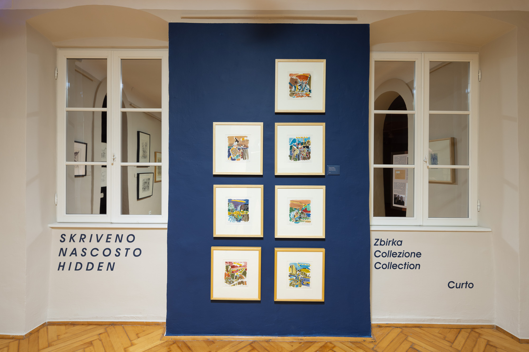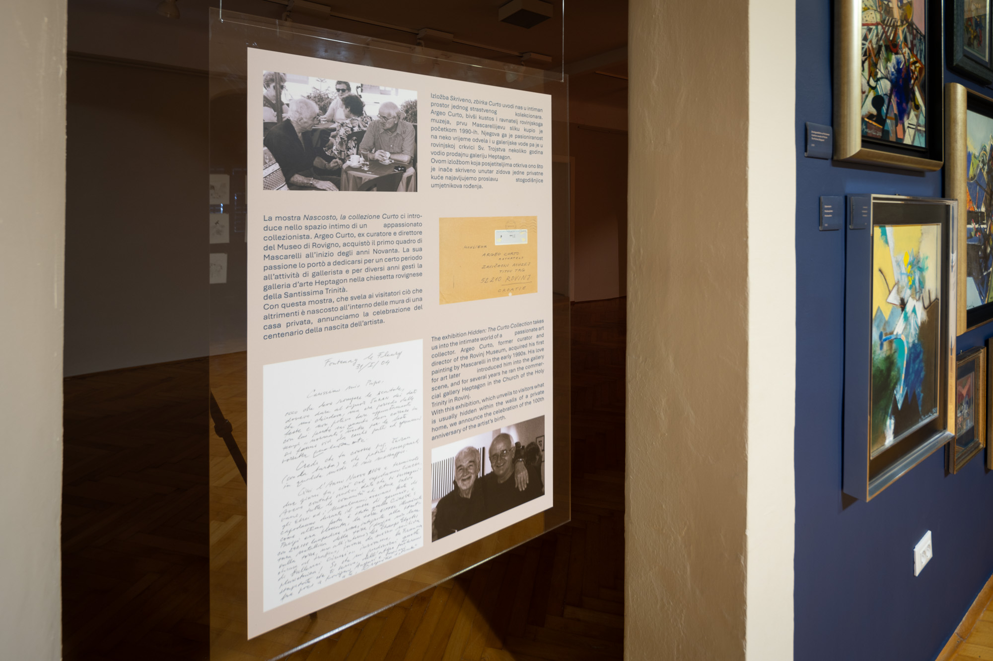 Izložba „Skriveno, zbirka Curto“ predstavlja izbor radova Bruna Mascarellija iz privatne zbirke rovinjskoga kolekcionara Argea Curta. U bogatoj zbirci suvremene umjetnosti, Mascarellijevi radovi zauzimaju posebno mjesto: nastali u različitim fazama umjetnikova stvaralaštva pokazuju promjene u njegovom načinu izražavanja, likovne izričaje i tematske okvire kojima se bavio. Zbirka je ujedno i rezultat bliskog prijateljstva između Curta i Mascarellija, obuhvaća radove koje je autor poklonio kao i one koje je Curto ciljano kupovao.